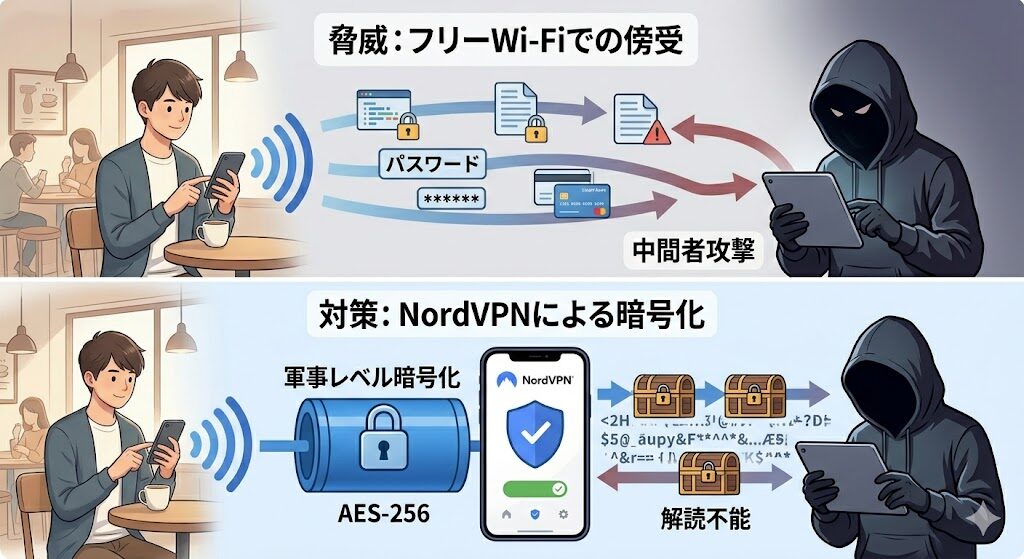 これが導入の最大の理由だ。旅行中の空港やカフェ、ホテルのフリーWi-Fiは非常に便利だが、悪意のある第三者による「通信の傍受(中間者攻撃)」のリスクが常につきまとう。