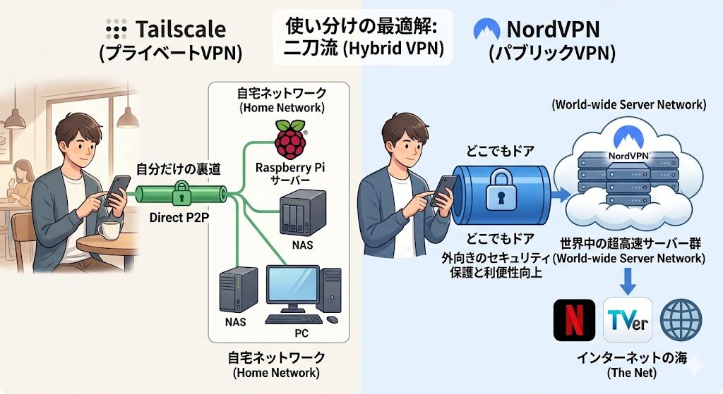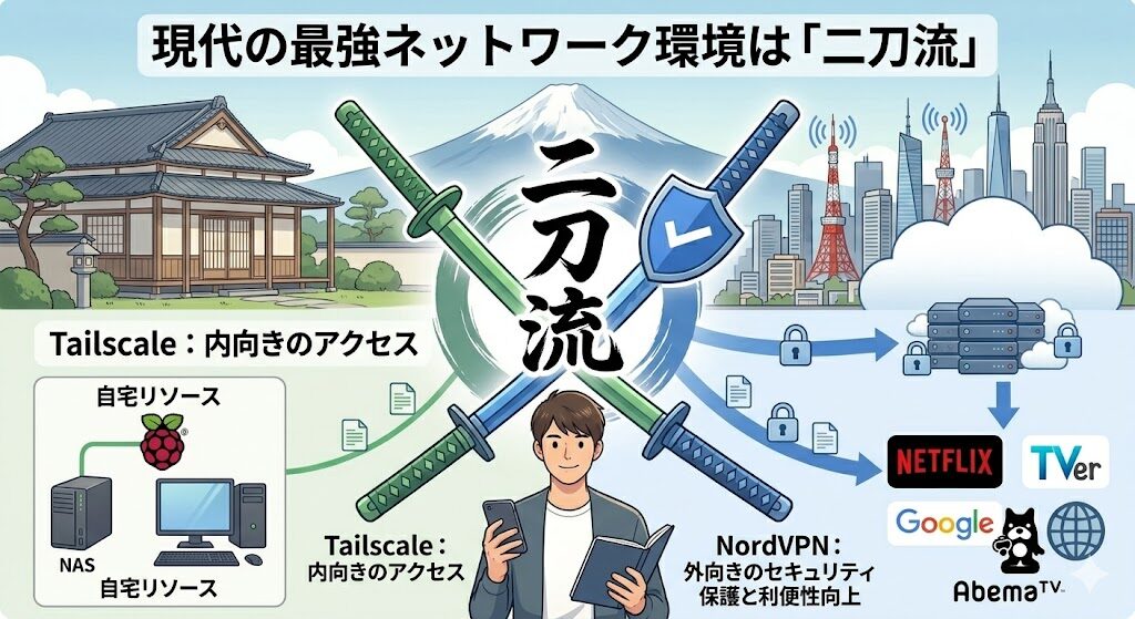 つまり、「内向きのアクセス」にはTailscale、「外向きのセキュリティ保護と利便性向上」にはNordVPNという使い分けが最適解となる。