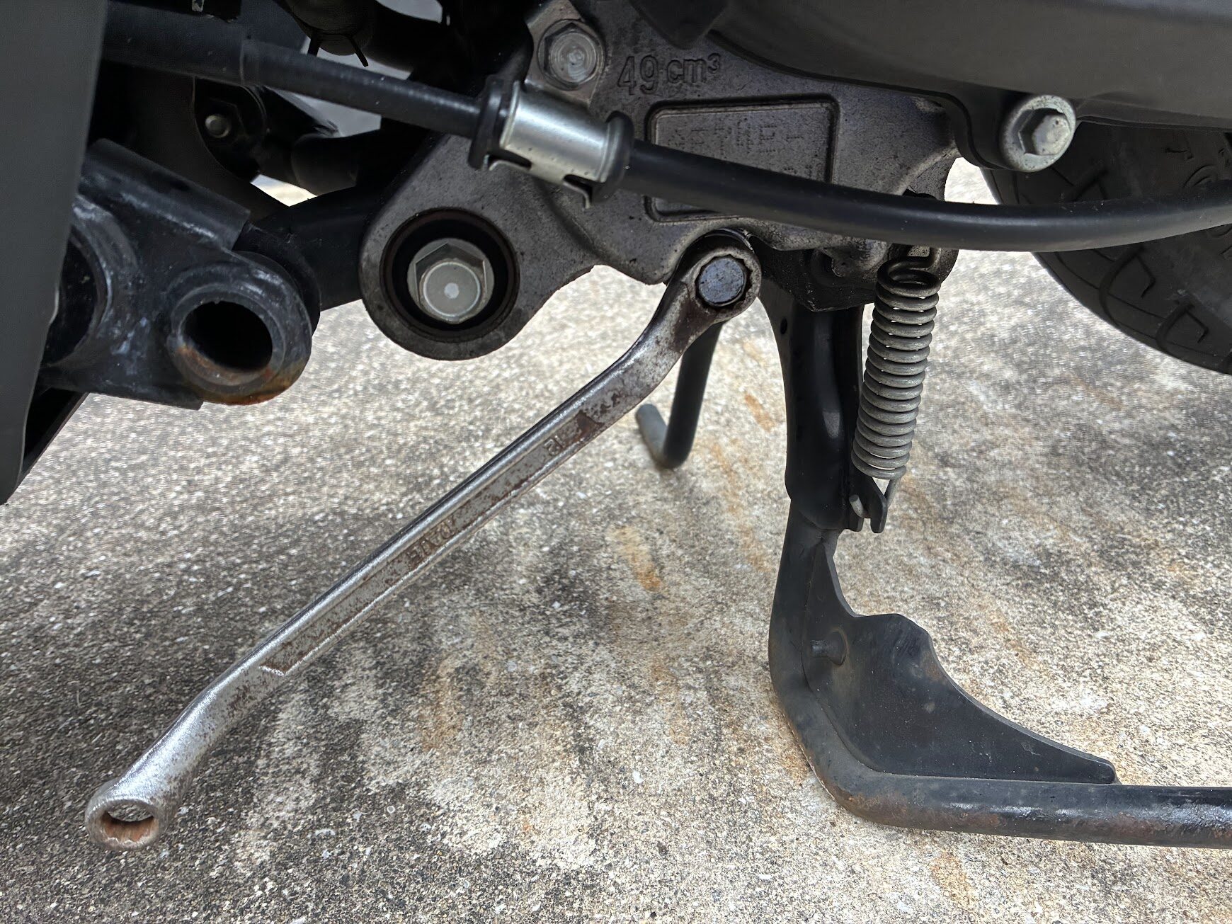 いよいよ古いオイルを抜く。車体下部にある「オイルドレンボルト」に12mmのメガネレンチをしっかりとかけ、「グッ」と力を込めて反時計回りに緩める。
